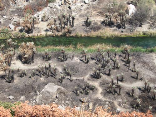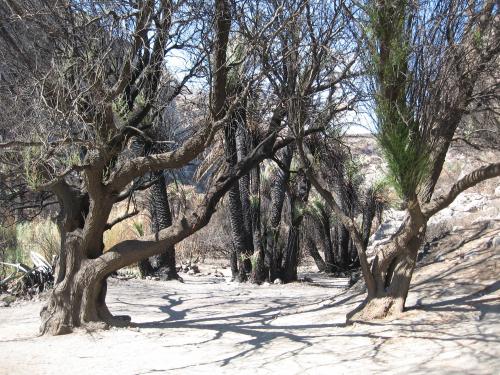 Добравшись до стоянки, нам предстоял длинный спуск вниз к пляжу. Уже на одной из смотровых площадок мы заметили выгоревший склон и черные стволы пальм.