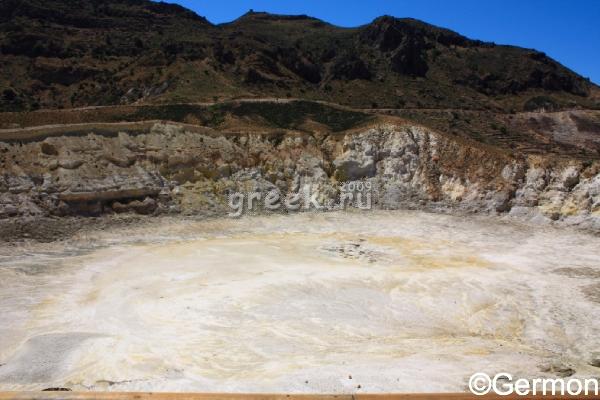 Кораблик приходит в порт - столицу острова Нисирос Мандраки, после чего туристов сажают в небольшой автобус, напоминающий российские ПАЗы, но с кондиционером, и везут по горному серпантину к вулкану. Интересно, что на острове всего 4 таких автобуса, которые четко справляются с возложенными на них обязанностями.