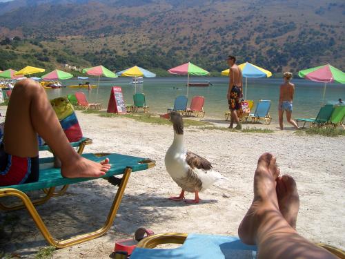 После обеда упали на лежаки. К нам тут-же подошли гуси «здороваться».Гуси очень мирные,но чуствуют себя хозяевами.Туристы очень охотно их кормят.В меню "жареного гуся" не видела,но думаю что зимой в местных ресторанах это основное блюдо.А куда иначе девать такую прорву гусей?