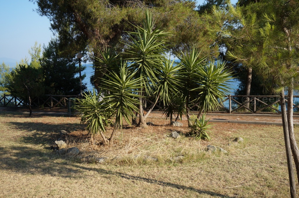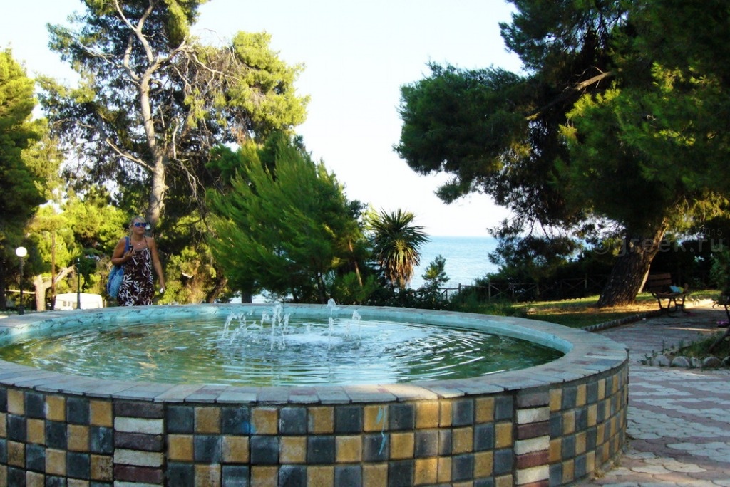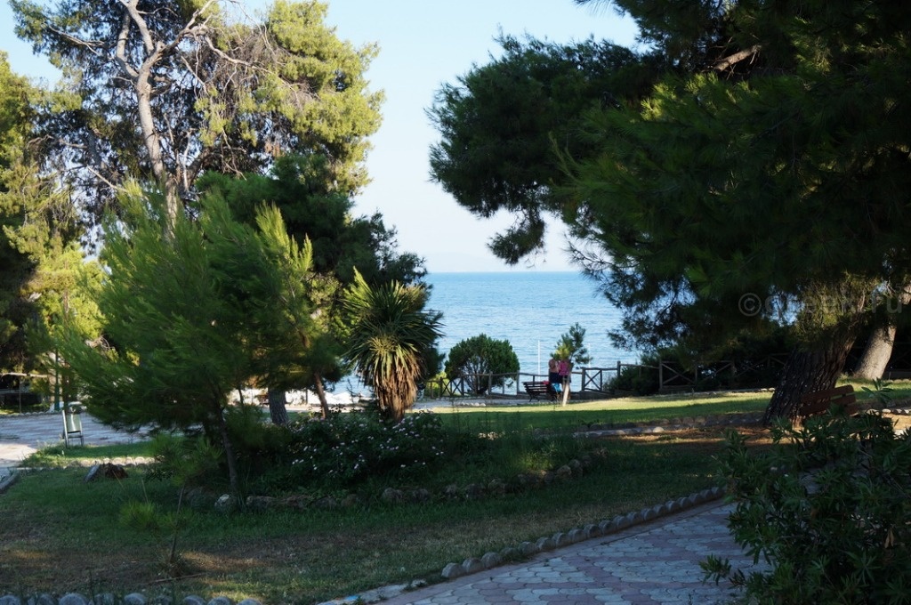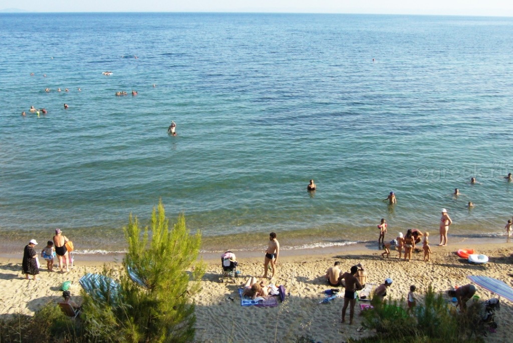 Теперь о пляже. В самом поселке хваленых пляжей Ситонии Вы не найдете. Местный пляж «на троечку». В песке очень много камней, водорослей. Единственное место, где более-менее можно комфортно заходить в воду – это спуск между отелем Golden Beach и парком (смотри фото № 1). Спуск пологий, выходит на волнорез, а от него в обе стороны чистый песок без камней, лежаки с зонтиками. Если я правильно поняла – лежаки слева – то ли от таверны Филиппи, то ли от Лианы, а справа – от La Strada. Мы лежаками не пользовались, так что цен не скажу. Нам вполне хватало места на песке на своем полотенце. Если приходить на пляж утром, то волн практически нет, море и пляж чистые (водоросли убирают), вода теплая, вход в море очень постепенный. Там мы и купались. Днем волнение моря усиливалось, да и загорающих становилось слишком много.