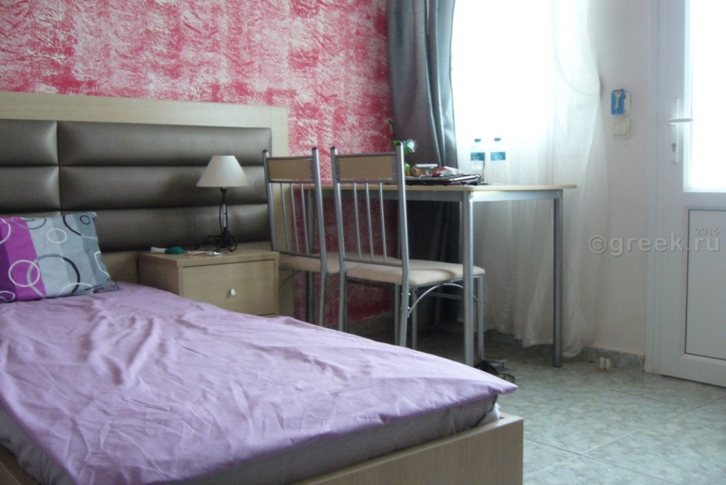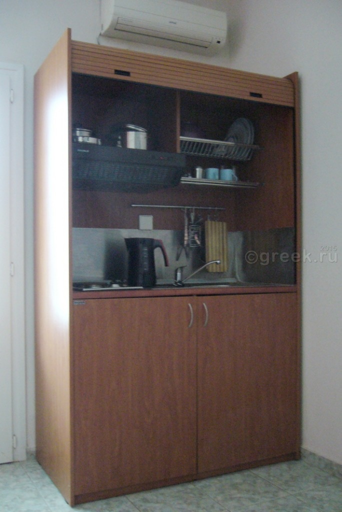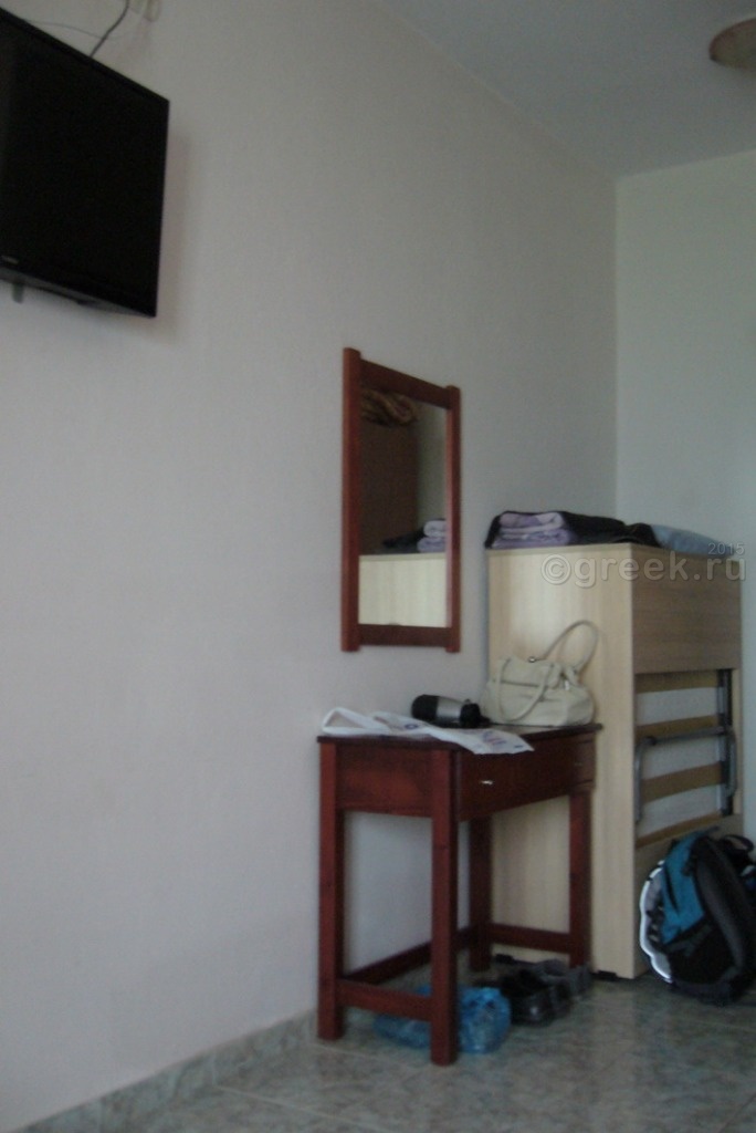Теперь несколько слов о нашем номере. Наш номер был расположен на первом этаже во втором здании. Комната довольно большая (особенно по сравнению с нашим номером в Kosta Famissi Hotel). Две односпальные кровати (которые по желанию могут быть сдвинуты, а в углубление посередине такой импровизированной кровати вкладывается кусок поролона), две тумбочки, на них настольные лампы; стол, два стула, зеркало, около него небольшой столик, сложенная раскладушка, шкаф, в котором было достаточно плечиков, небольшой сейф, внизу шкафа два больших ящика. На стене висел плоский телевизор, русский канал вроде был, но мы телевизор не смотрели. Кухонный уголок: электроплитка с двумя конфорками, верху вытяжка, раковина, электрический чайник, посуда от сковородок и кастрюль до тарелок, чашек, ложки, вилки, ножи, дуршлак.