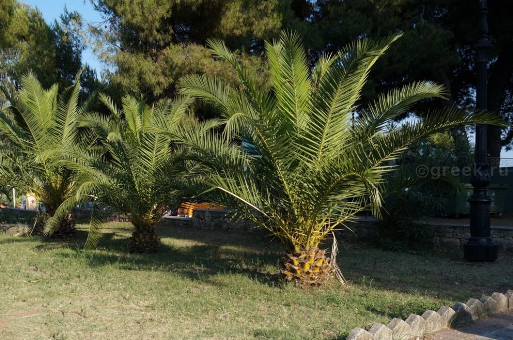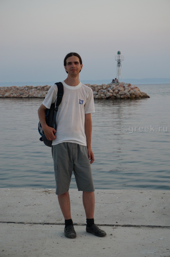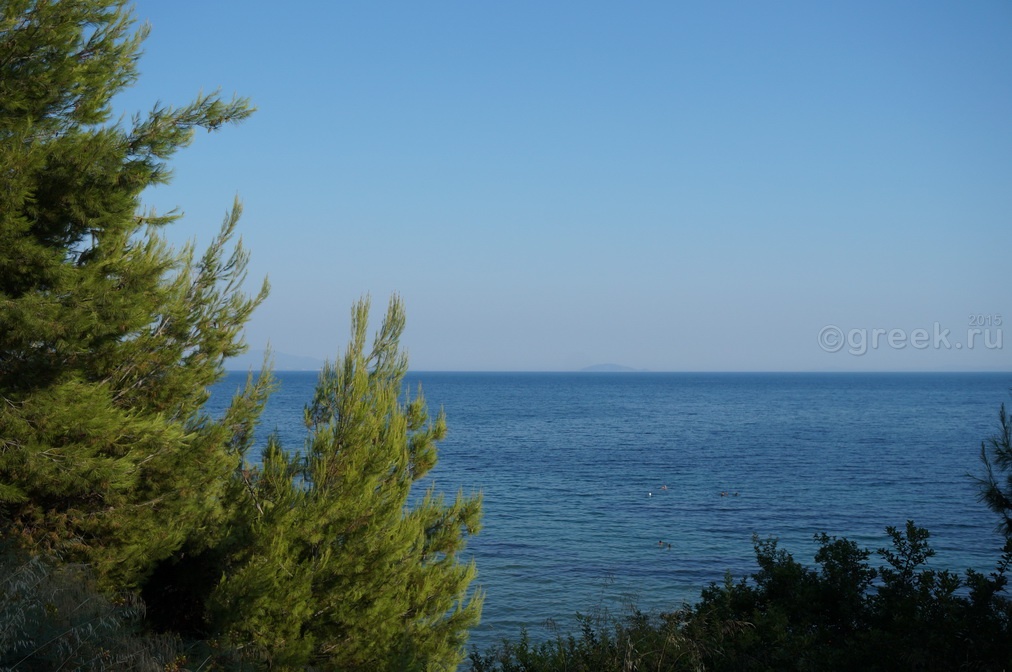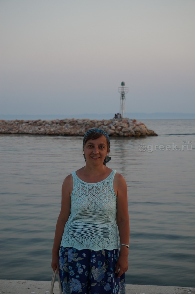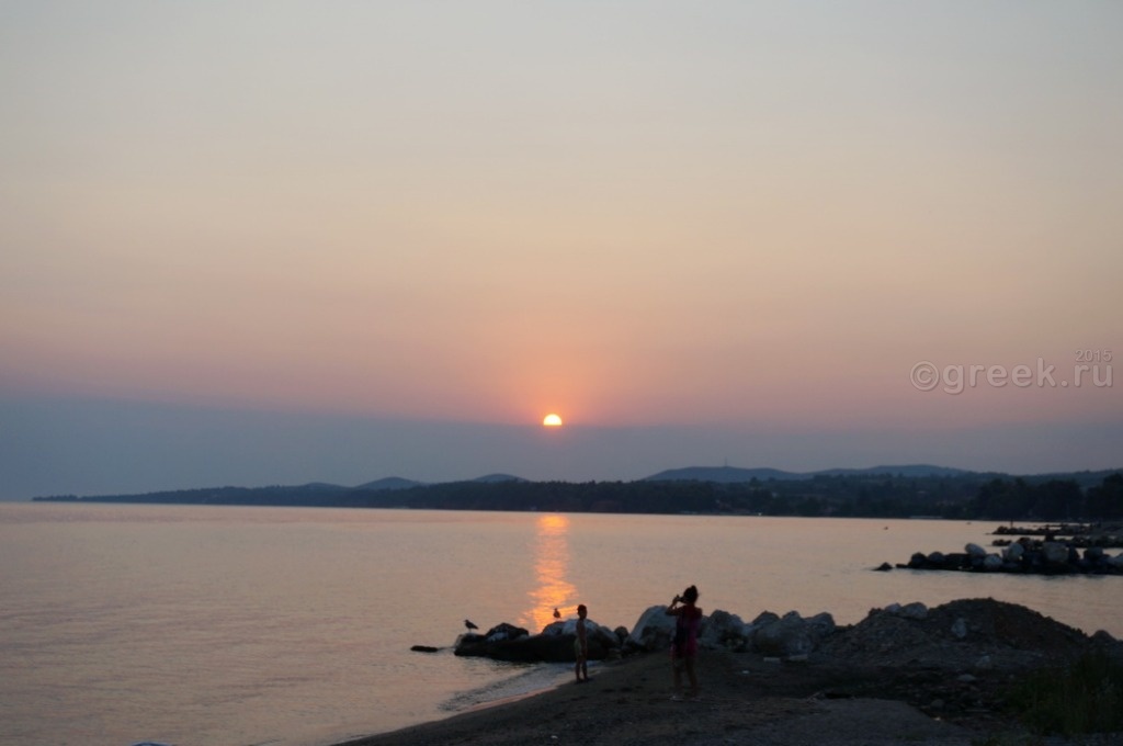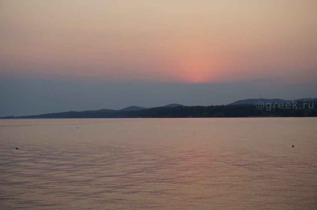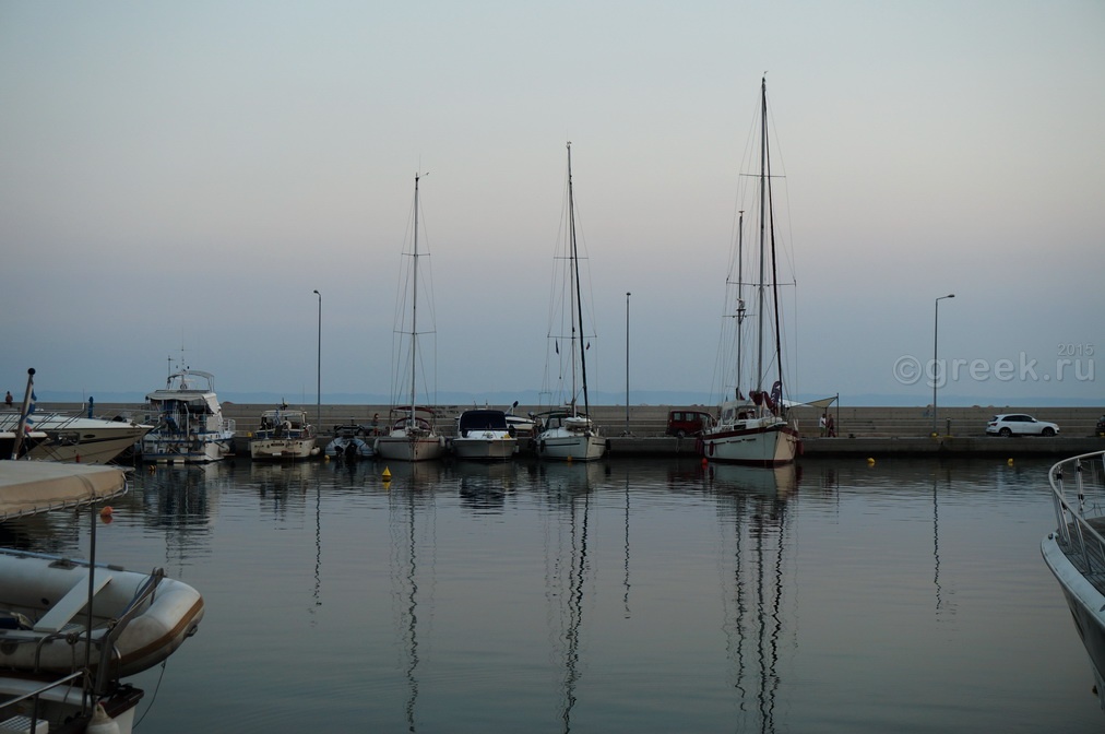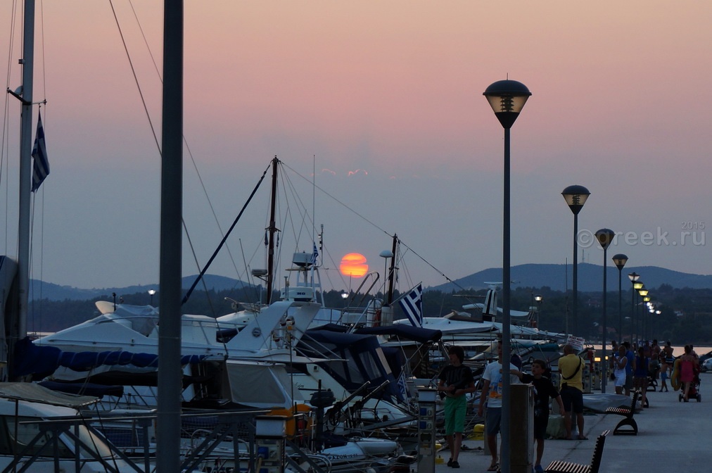 Теперь коротко о том, чем же мы занимались. Машину мы не водим, так что поездка по лучшим пляжам Греции была для нас невозможна. Загорать на местном пляже целый день – не вариант. В один из дней вечером мы решили прогуляться в соседний поселок Никити. По карте выходило что-то около семи километров. Вдоль берега моря идти плохо, набережная только в Никити, а до него – песок и камни. Вдоль трассы идти нельзя – очень интенсивное движение. Хорошая дорога проходит через сосновый лес вдоль вилл и дорогих отелей. Но она петляет, так что выходит уже не семь километров, а больше. Мы не спеша дошли до марины в Никити за полтора часа. Вышли из своего номера мы в половине седьмого вечера, так что в Никити удалось сфотографировать интересный закат.