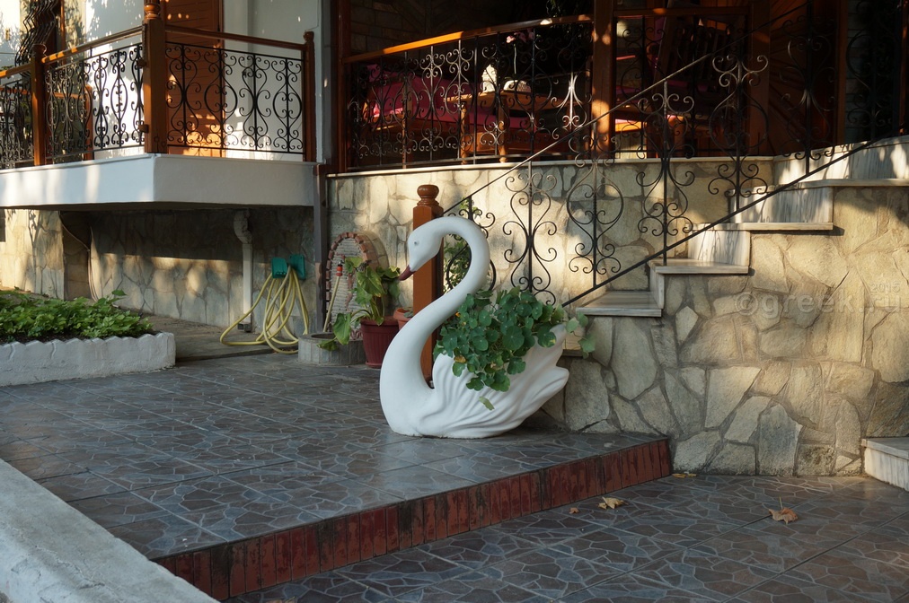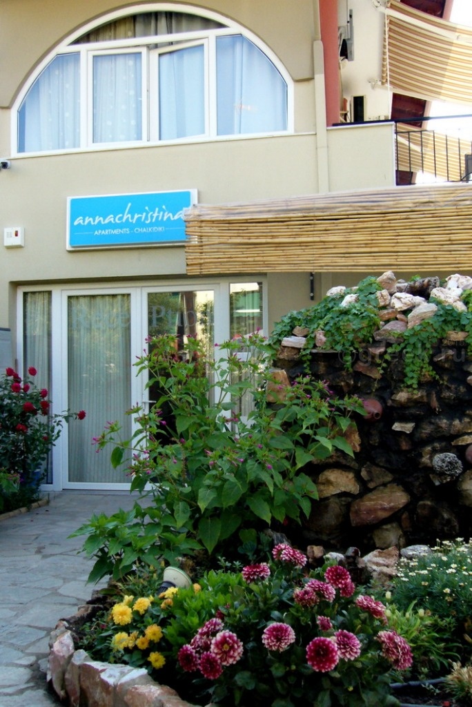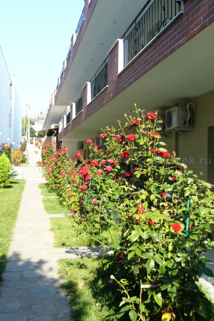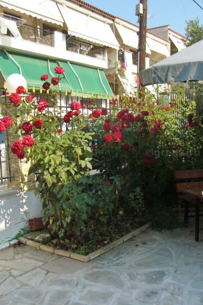 Теперь подробно об апартаментах. Anna-Christina Apartments расположена на второй (в сторону Никити) улице, соединяющей трассу с морем, рядом (буквально стенка к стенке) с 4-You (на фото № 1 вверху справа). Это два здания, плотно примыкающих друг к другу, спускающихся по склону. Главная фишка этих апартаментов – розы. Цветы везде – при входе, около reception, вдоль дорожки, по которой жильцы идут в свои номера. Между розовыми кустами ползают забавные черепашки. Мы вроде их фотографировали, но найти эти фото не могу.