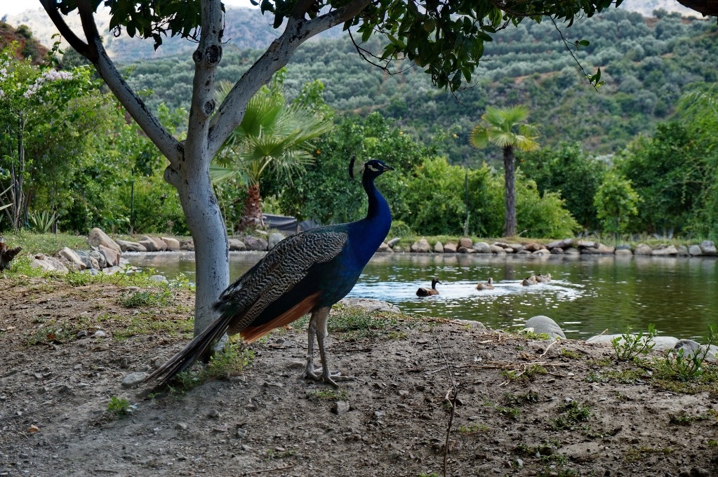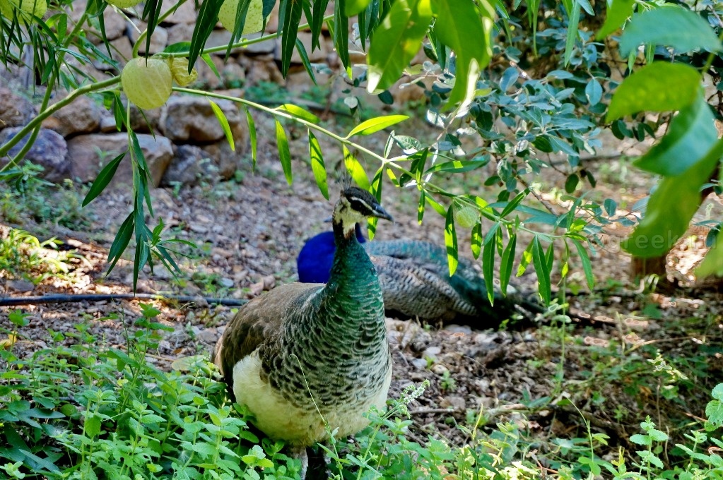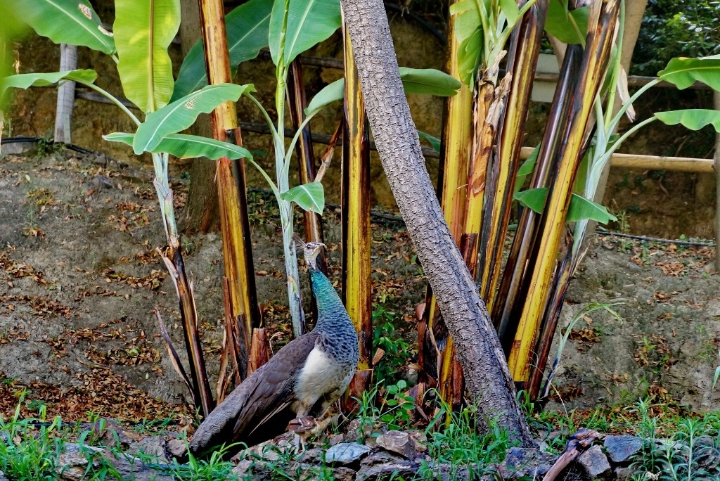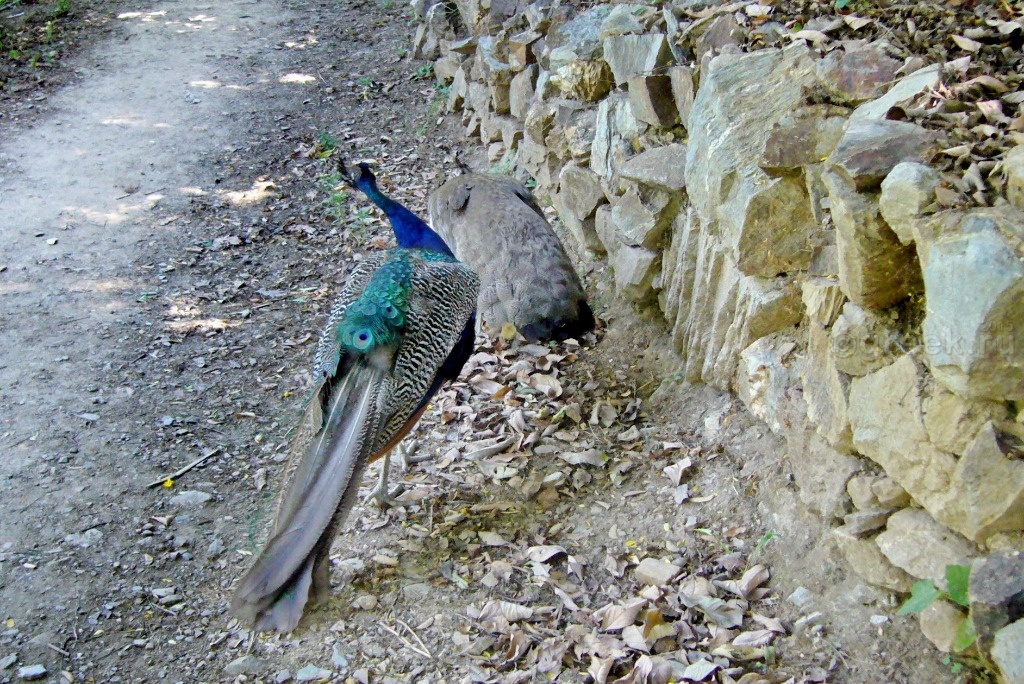 Павлинов в Ботаническом парке очень много, они не боятся посетителей, свободно разгуливают там вместе с цыплятами.