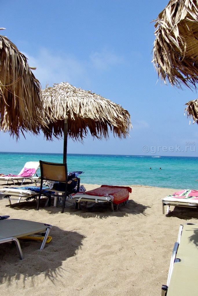 На пляже, кроме лежаков с зонтами, есть раздевалки, душ, туалет, чуть подальше – таверна.