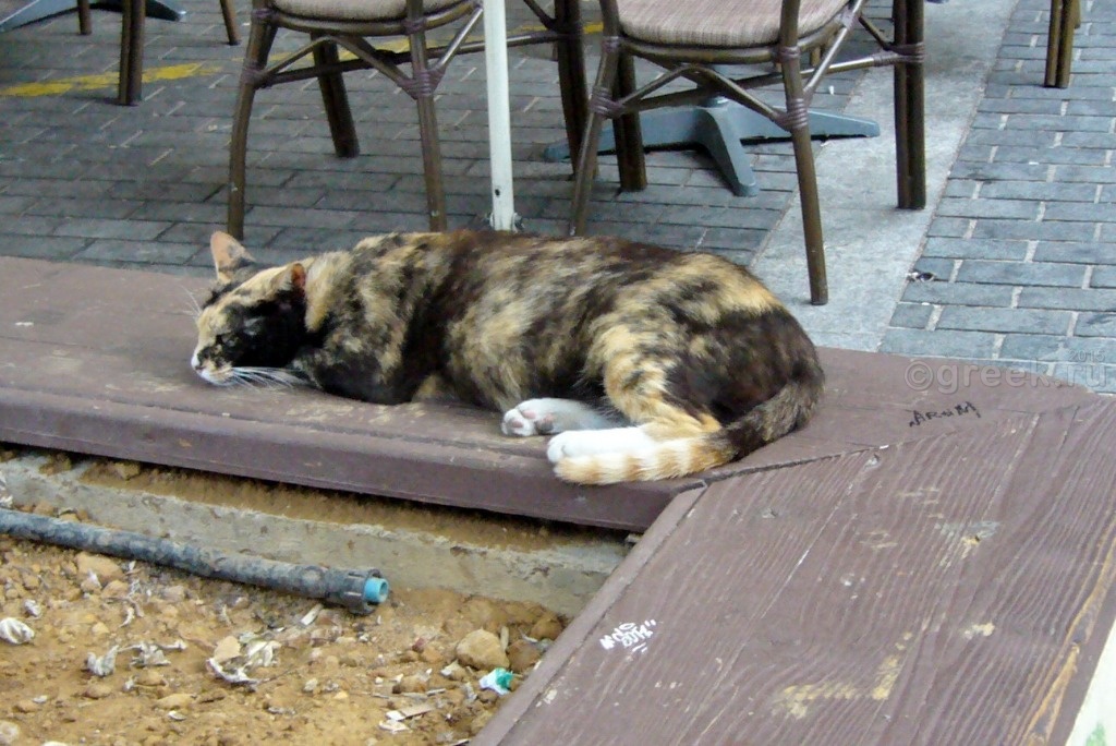 Рядом работали кафешки, под деревом мирно спала трехцветная кошка.