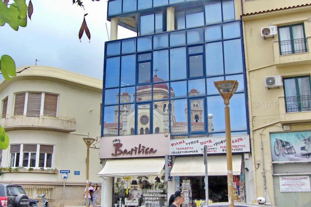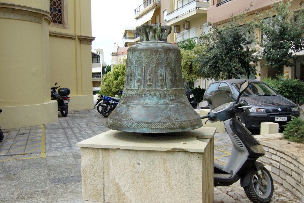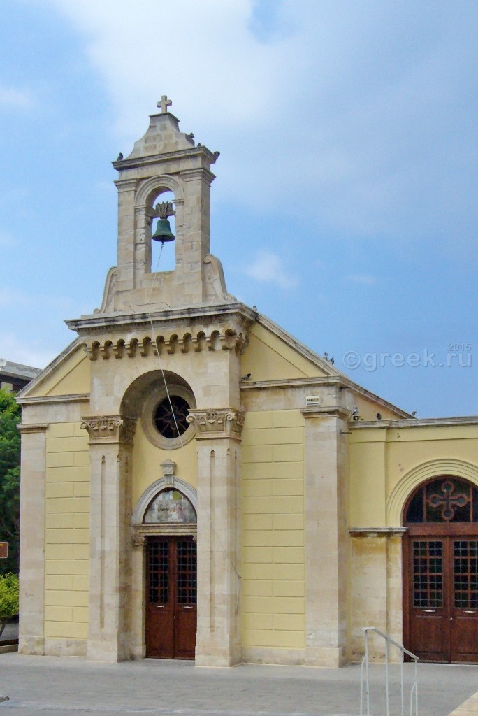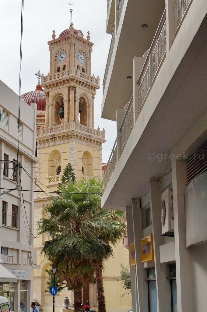 Дальше по улице Кирилла Лоукареса идем до ул. 1821 года, которая названа в честь года начала на Крите войны за независимость от Турции. Проходим два квартала и в просвете узкой улицы Karterou видим одну из башен собора святого Мины.