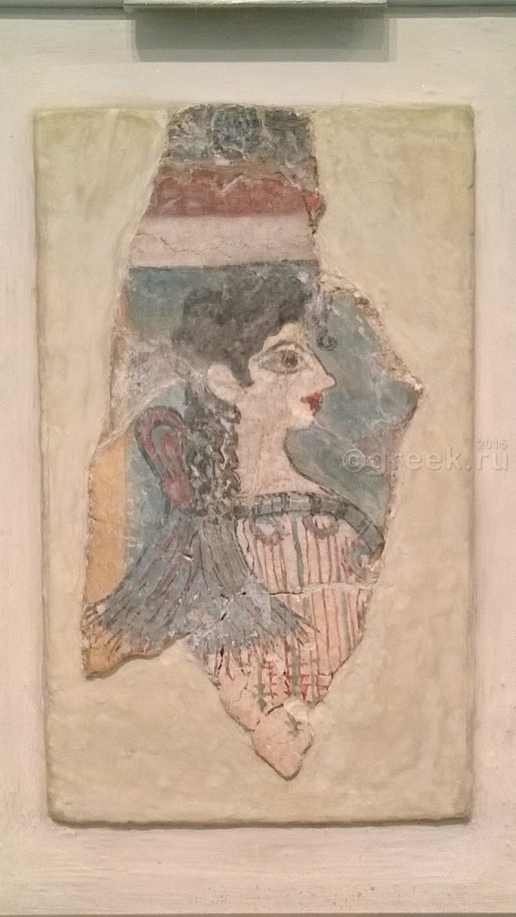 Осмотр первого этажа у нас занял больше часа, но на втором этаже было не менее интересно. Там представлены оригиналы фресок, найденных в Кноссе. Причем фрески при переносе их в музей плохо сохранились, поэтому они нарисованы, а сверху на них наклеены оригинальные кусочки штукатурки.