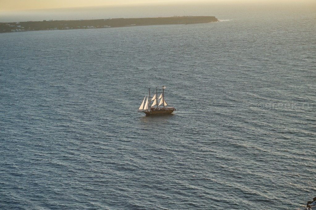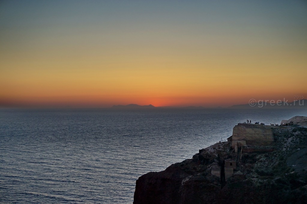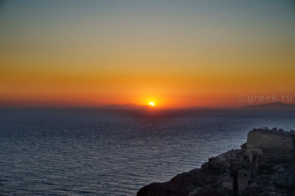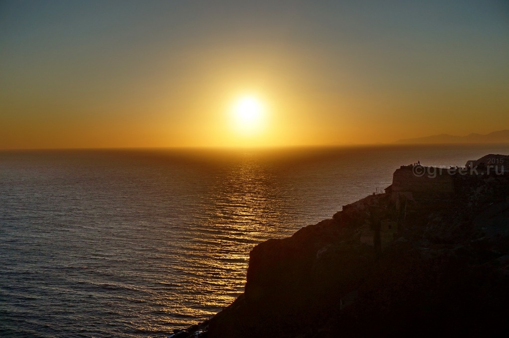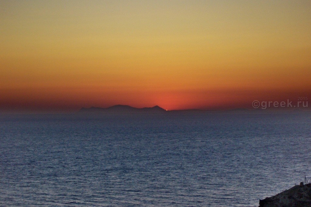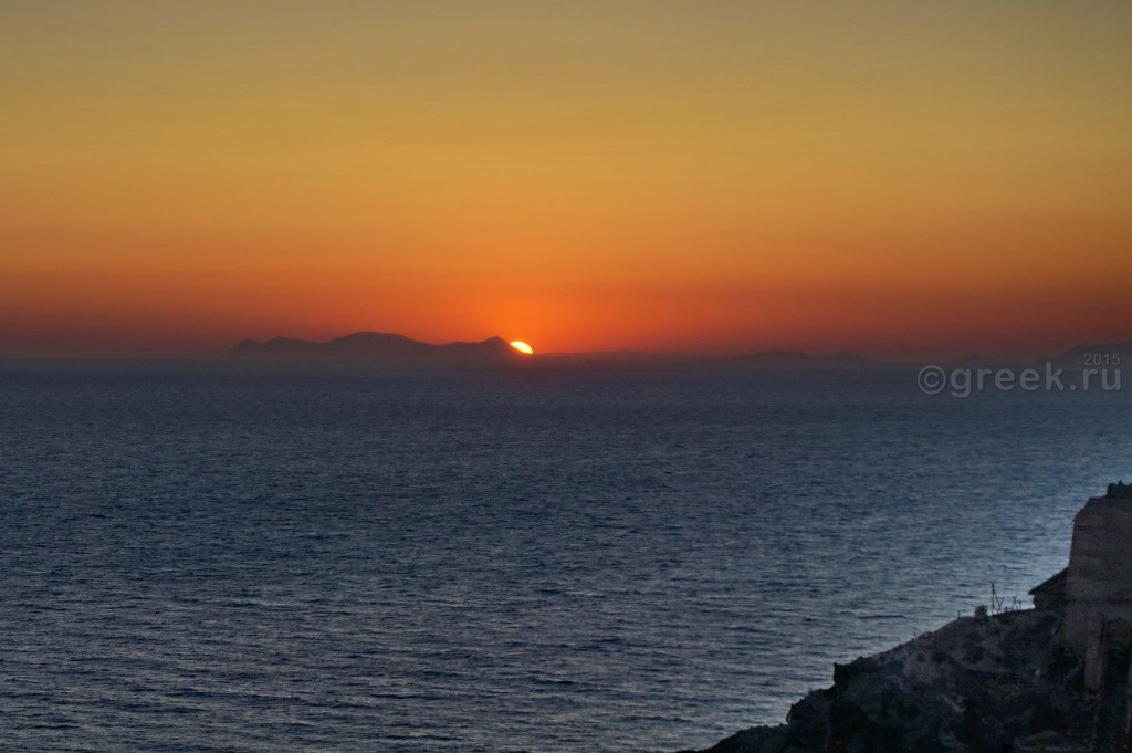 Когда солнце почти дошло до горизонта, стало заметно, что оно заходит не в море, а за остров (Сикинос (Sikinos) или Фолегандрос, не разобралась).