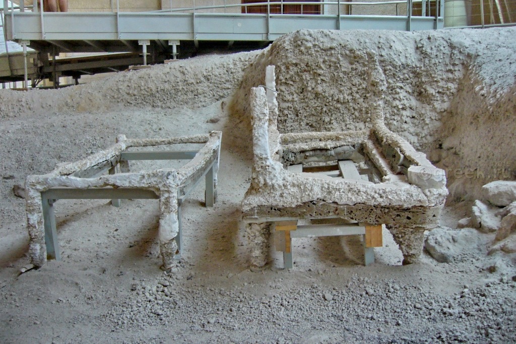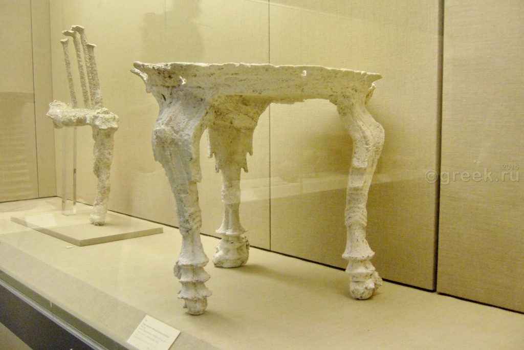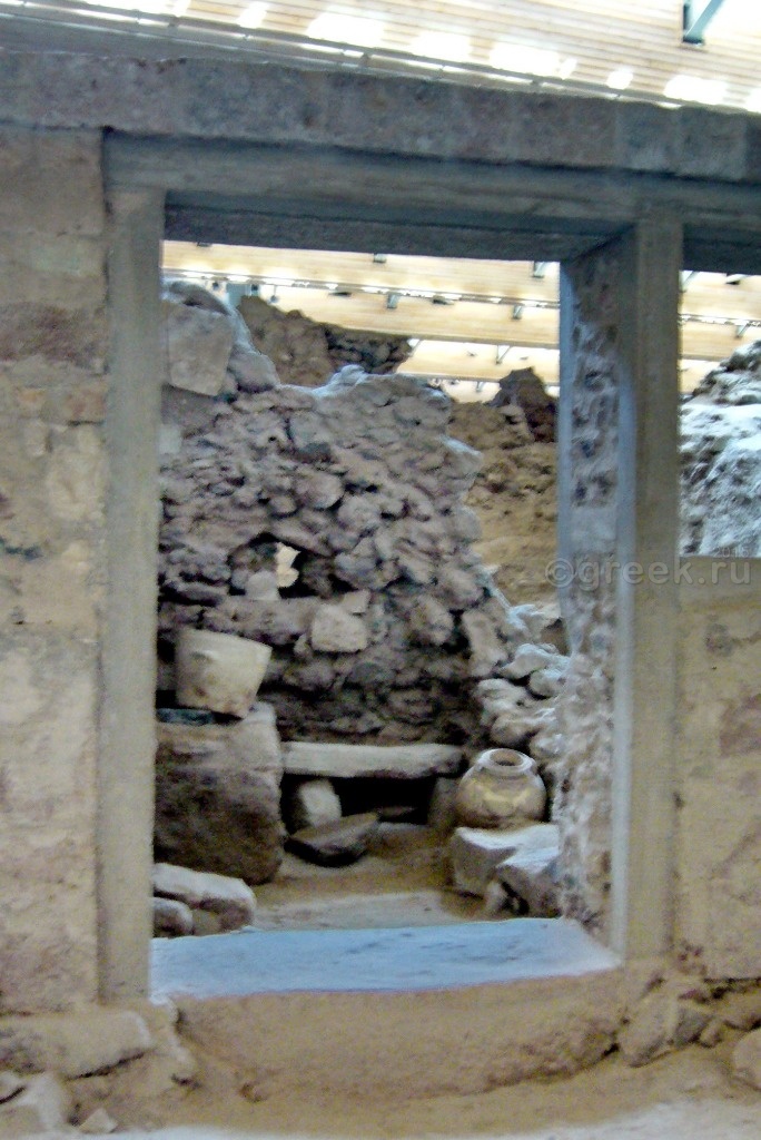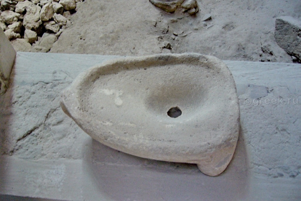 Кое-где оставлены найденные глиняные сосуды, элементы мебели, даже древний унитаз.