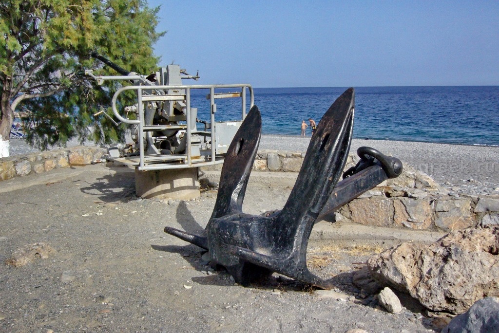 Критяне свято чтут память о своих героях, которые защищали родной остров хоть от турецких захватчиков, хоть в годы второй Мировой войны. На берегу Ливийского моря стоят зенитка и якорь как память об обороне южных берегов Крита.