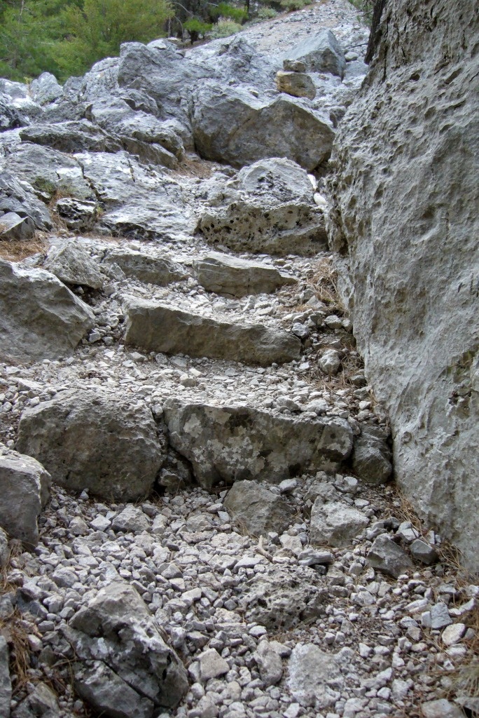 Поворотов серпантина не меньше десятка. Здесь уже не дорожка, а узкая тропинка, усыпанная мелкими камешками, по которым ноги так и стараются проскользнуть. Надо быть внимательным и не торопиться. В некоторых местах деревянные перила сломаны.