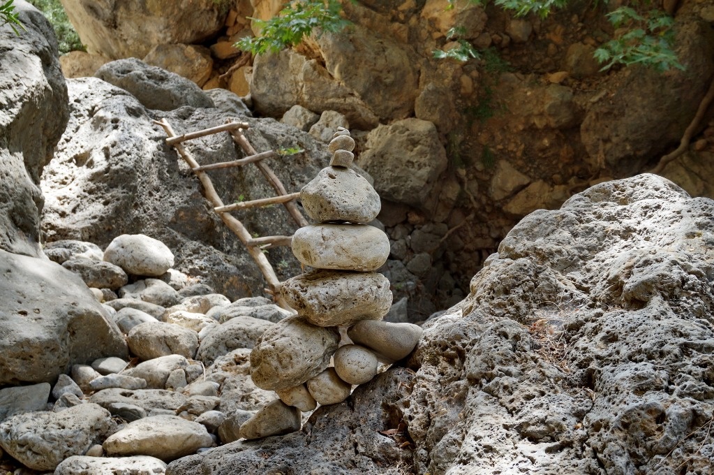 В одном месте, уже после отметки «3 км» встречается спуск по приставной лестнице. Каменная пирамидка указывает, что идти надо именно здесь.