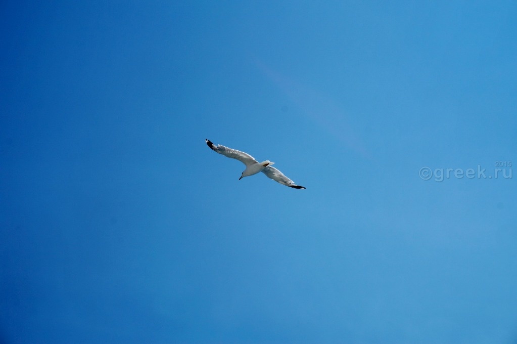 Чайка прилетела на разведку, но никто ее кормить не стал, и она исчезла в голубом просторе
