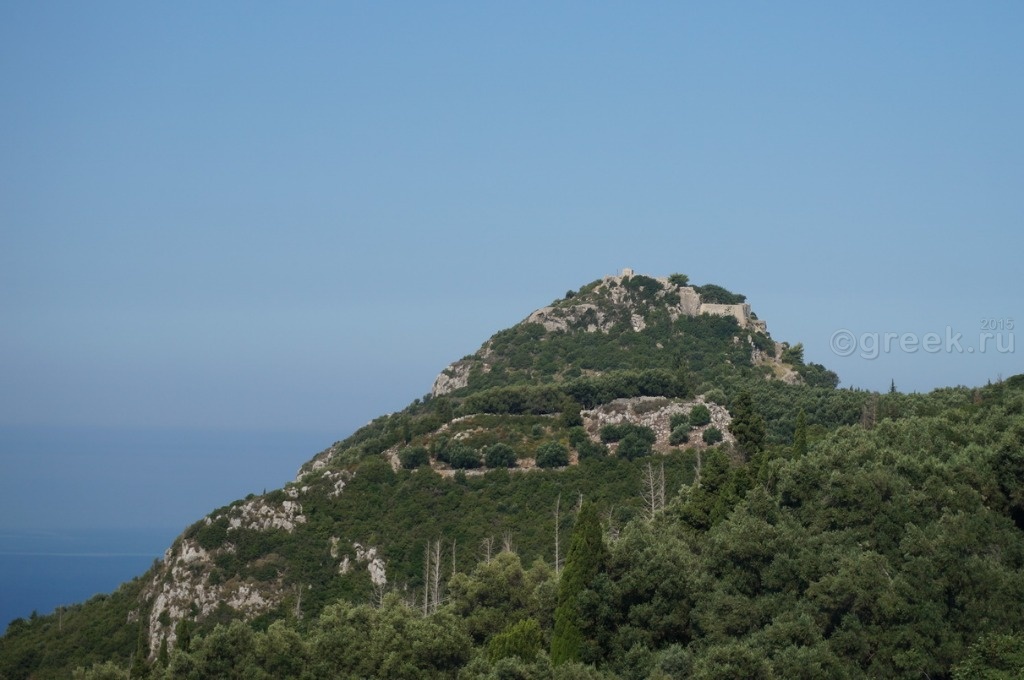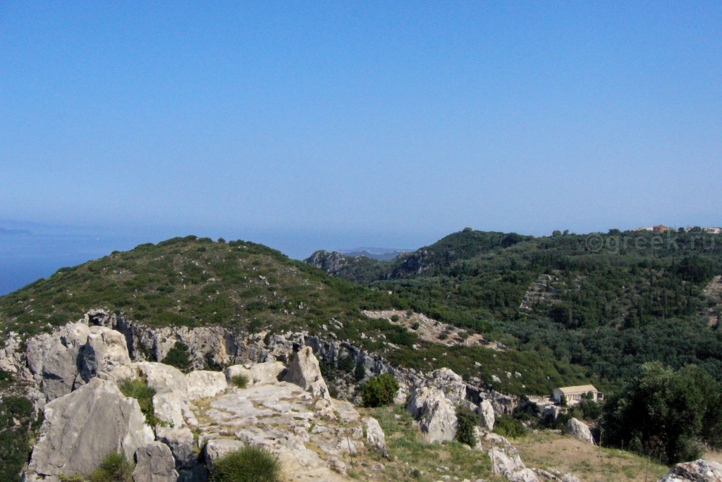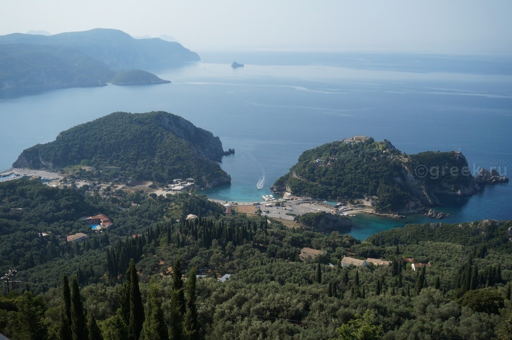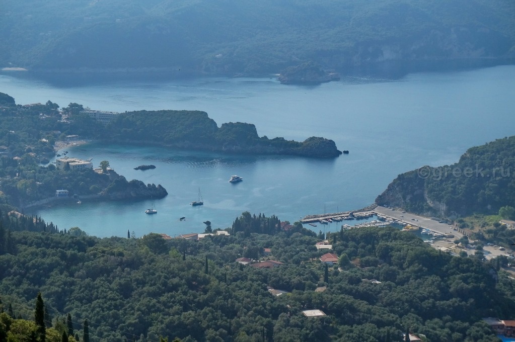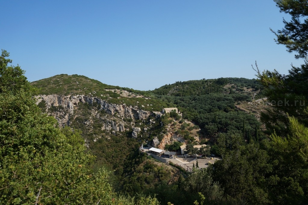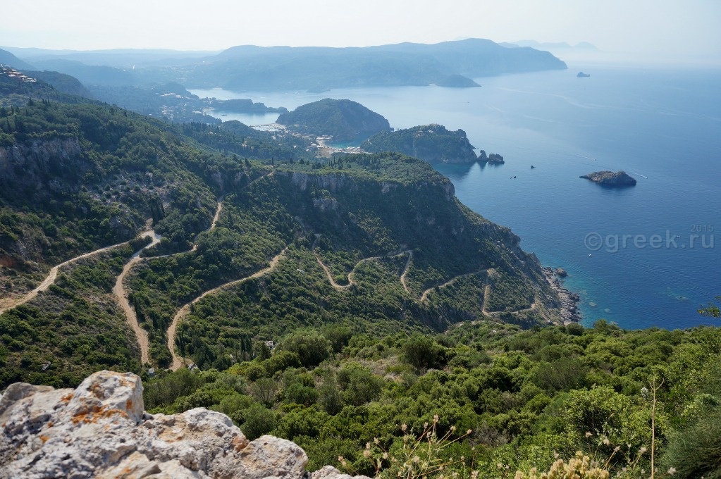 С вершины открываются удивительные виды и на парковку, и на дорогу, по которой мы ехали, и на Палеокастрицу и грунтовый серпантин, и на синее-синее море вокруг.