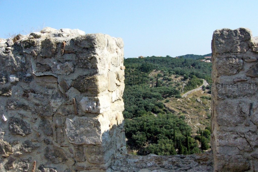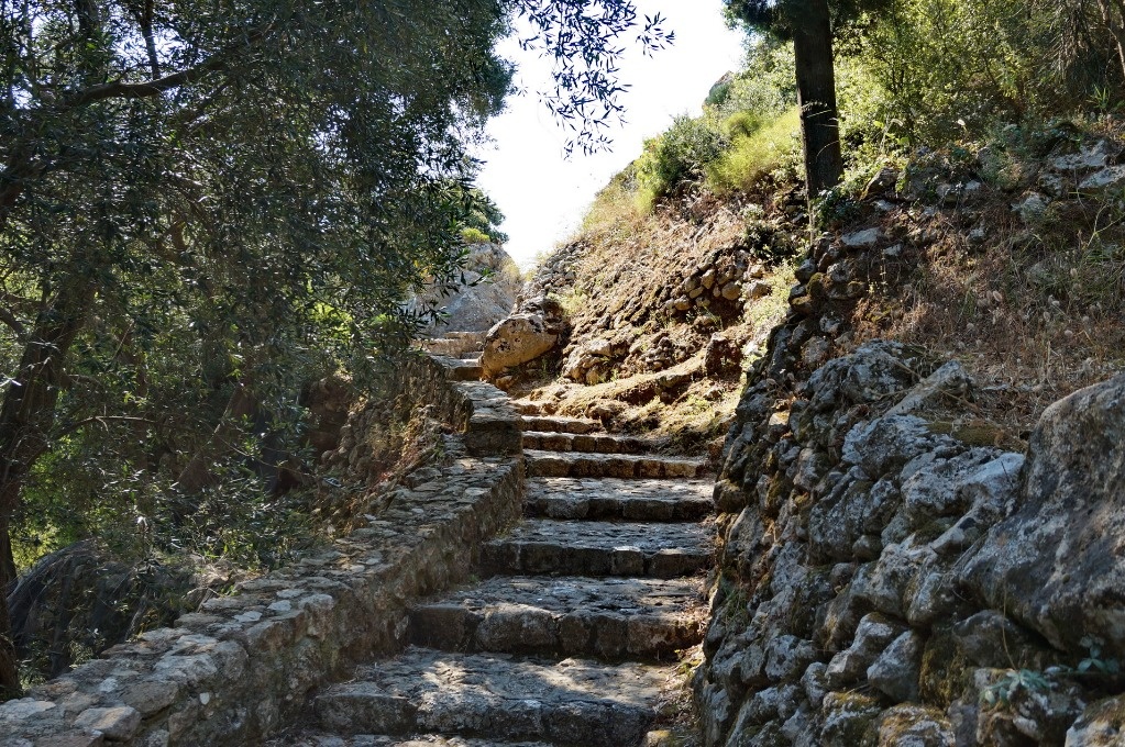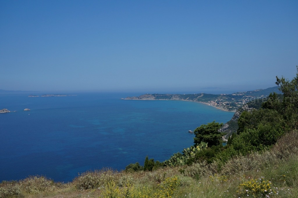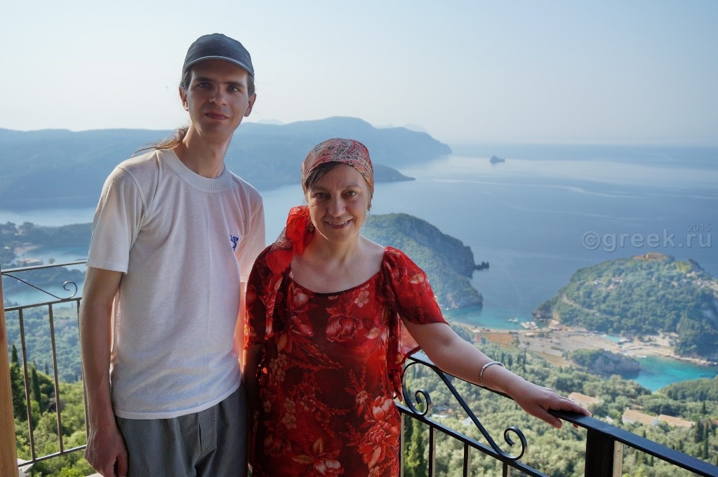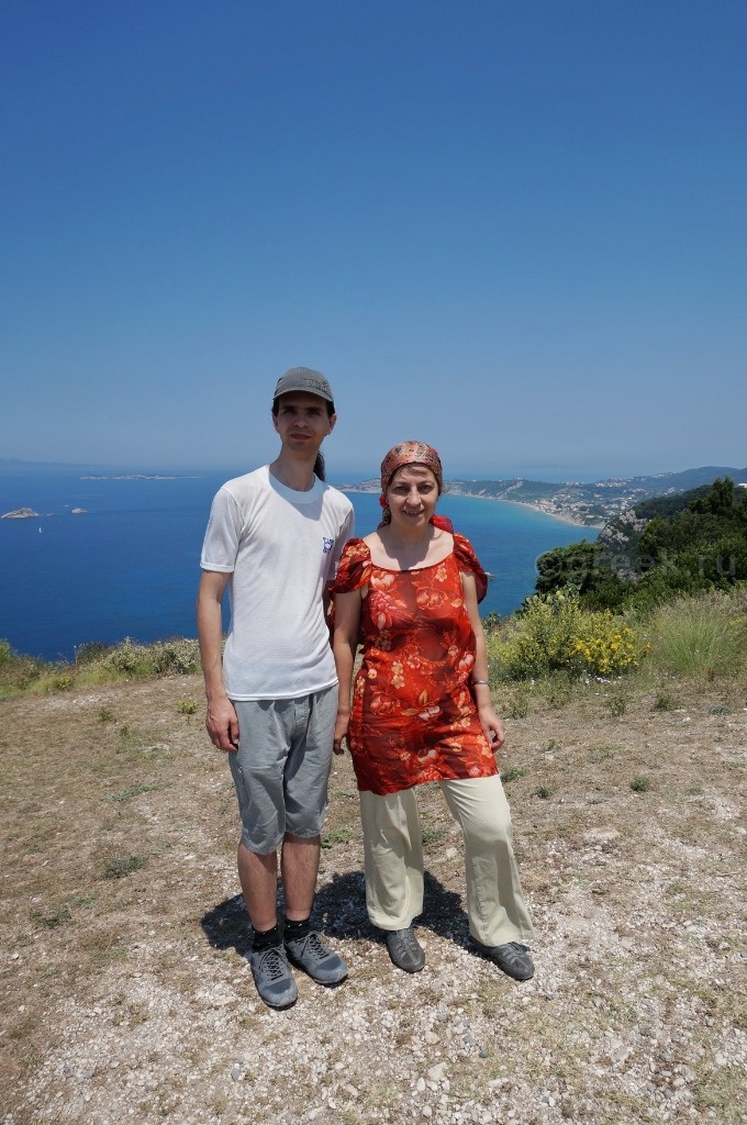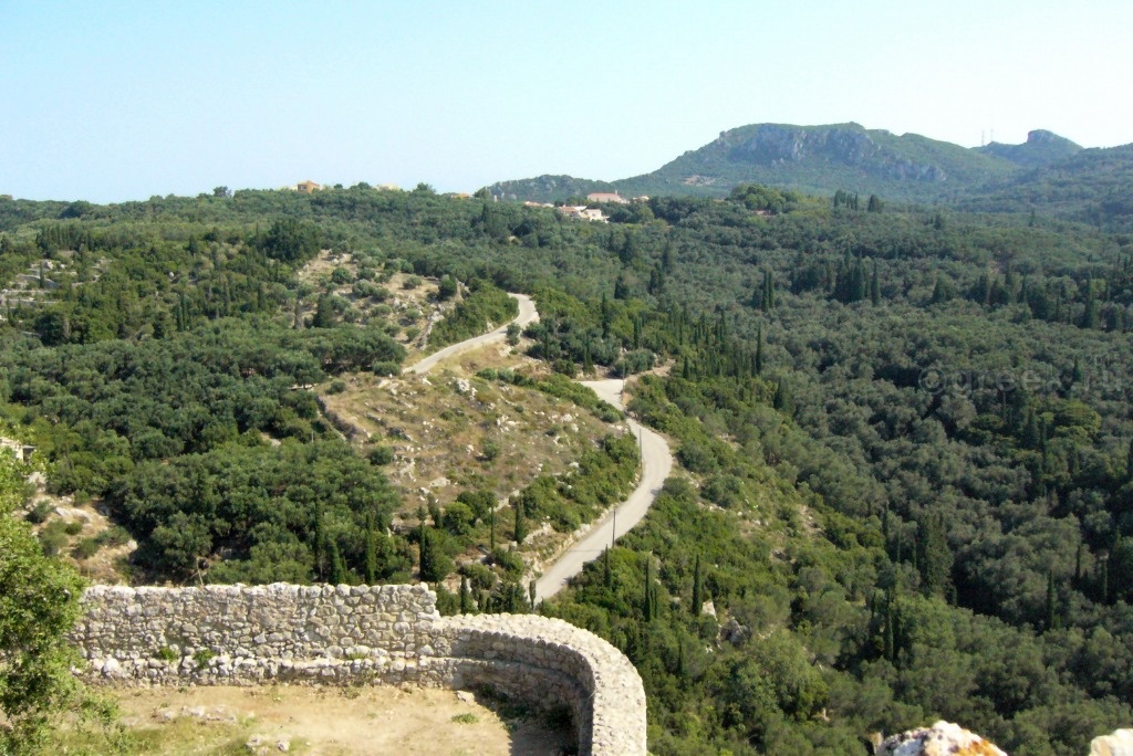 С вершины открываются удивительные виды и на парковку, и на дорогу, по которой мы ехали, и на Палеокастрицу и грунтовый серпантин, и на синее-синее море вокруг.