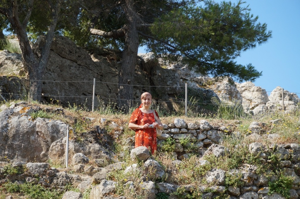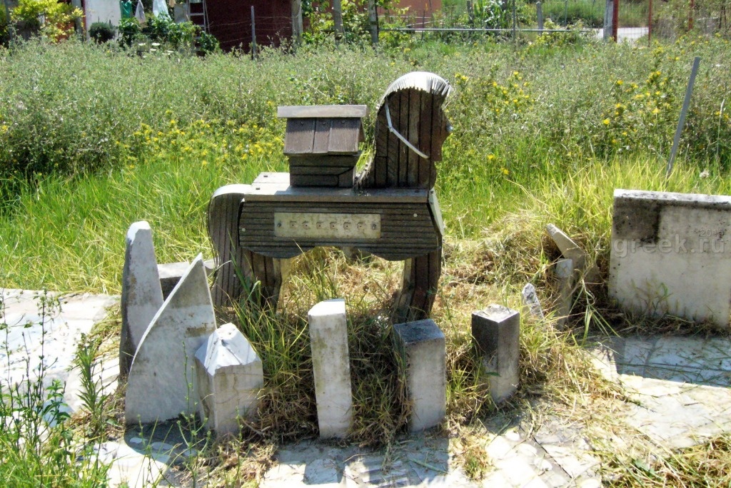 Вот и Афиона. Подъезжаем к месту, где разворачивается рейсовый автобус. Надпись «парковка запрещена». Костас, оглядев все вокруг, паркует машину как раз на этой надписи. Это для туристов парковка запрещена, а коренному населению, видимо, можно. Подходим к памятнику.