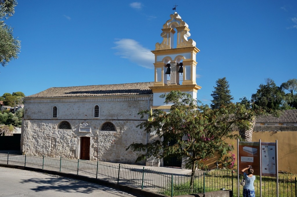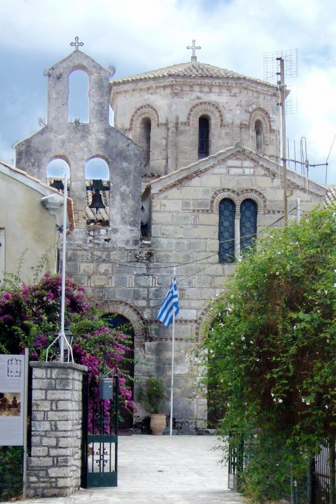 Святые Ясон и Сосипатр были учениками апостола Павла, они первыми начали проповедовать христианство на Корфу. Это один из немногих византийских храмов, сохранившихся на Корфу, так как правившие в течение долгого времени на острове венецианцы запрещали строительство церквей в византийском стиле. В отличие от распространенных на Корфу прямоугольных базилик, этот храм представляет собой крестообразное (если смотреть сверху) здание с куполом в центре креста. Церковь была расписана фресками 11- 14 веков. В 15 веке здесь был монастырь, именно в нем укрывалась жена Фомы Палеолога Екатерина, когда Константинополь был захвачен в 1453 году турками. Церковь и сейчас действующая. Каждый день, проходя мимо нее, мы любовались гармонией и совершенством архитектурных деталей.