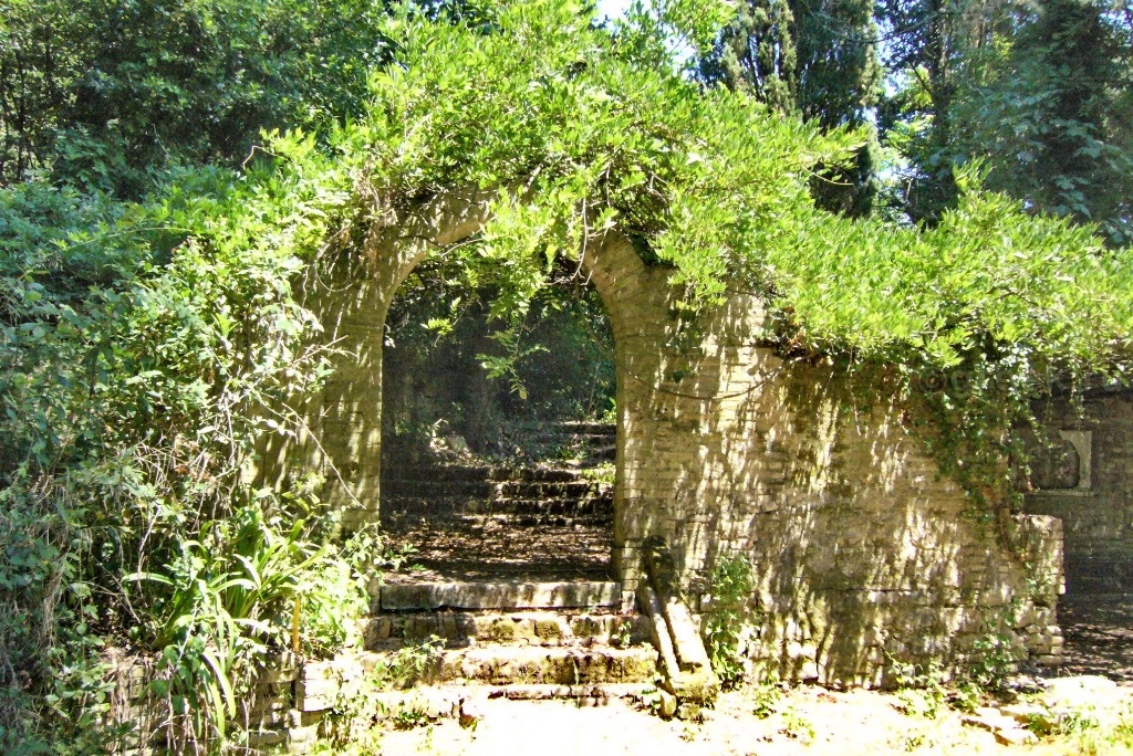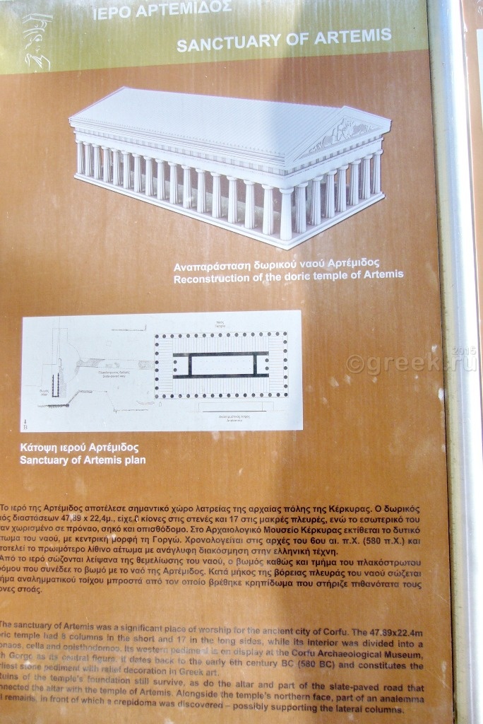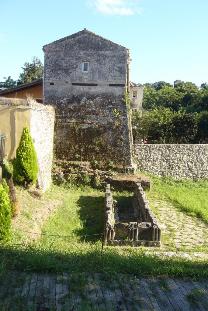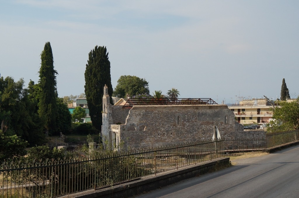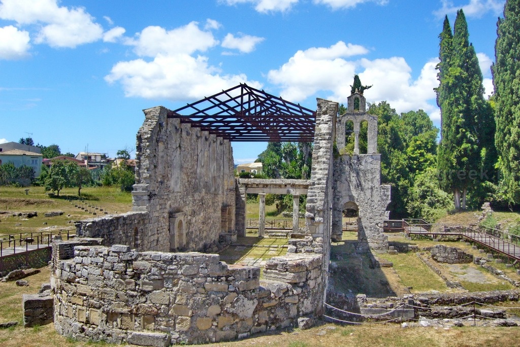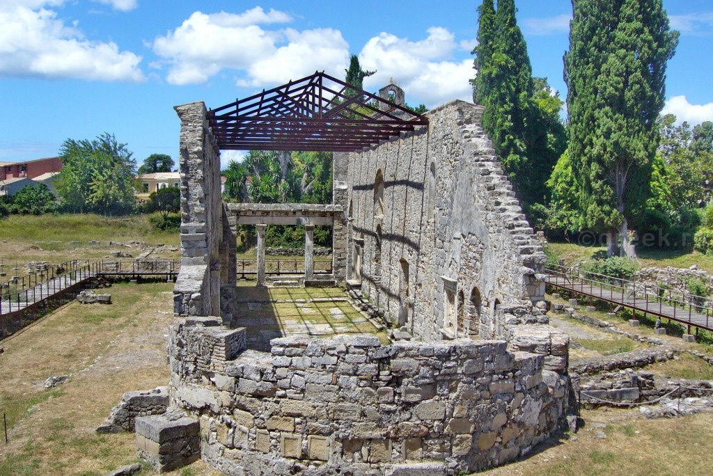В том же 5 веке н.э. была построена христианская базилика. Она была одним из красивейших храмов не только на Корфу, но и во всей Греции. Изначально это была пятинефная церковь с внутренним двориком, украшенным красивыми мраморными скульптурами. Массивная деревянная крыша, украшенный мозаикой пол, встроенные античные колонны. Позже церковь перестроили, оставив один неф с двумя проходами. В средние века здесь был монастырский комплекс, посвященный Богородице Анафонетрии. Храм оставался действующим до 20 века. Бомбардировки во время Второй Мировой войны разрушили уникальное здание. Где-то читала, что вход на территорию базилики иногда открывают, можно побродить по деревянным подмосткам и рассмотреть здание, но все время, когда мы проходили мимо, территория была закрыта. Хотелось бы, чтобы базилика была восстановлена, но бережно, на основании сохранившихся чертежей (я думаю, что в государственном архиве Корфу есть такие). Сейчас древние мозаики и скульптуры находятся в музее Византийского искусства в Старой крепости (в воротах).