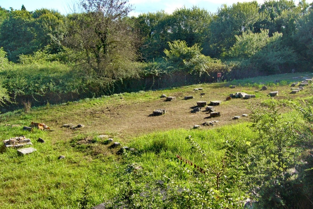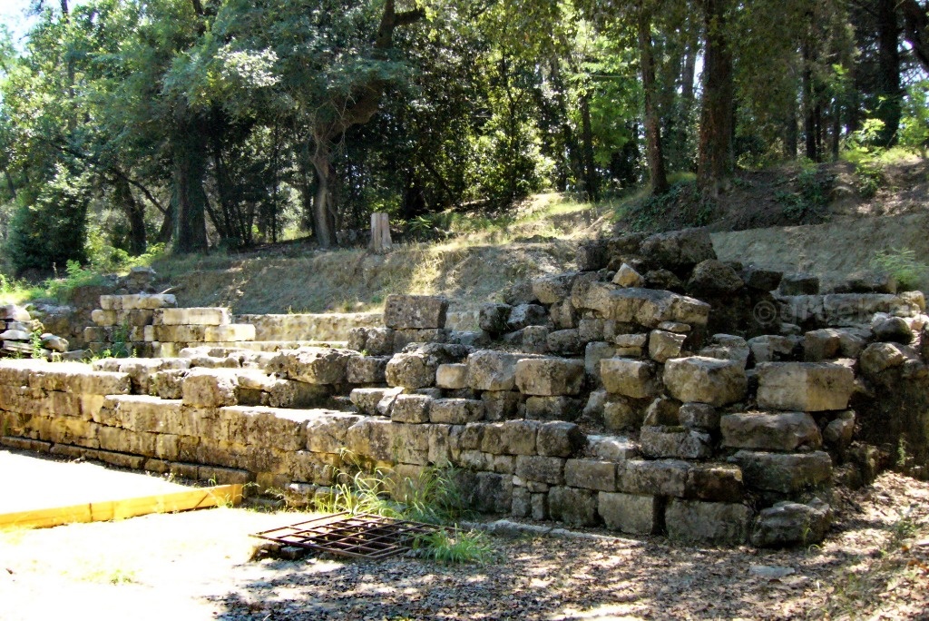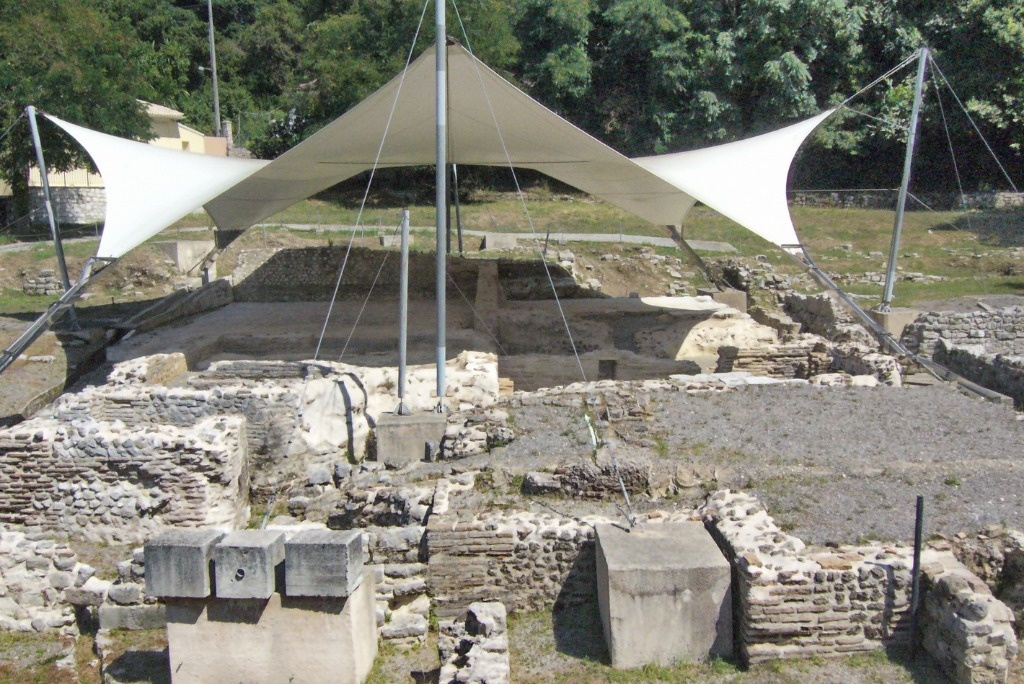 Напротив базилики находятся раскопки Римских бань. Под тентом можно издалека рассмотреть, что пол выложен мозаикой.