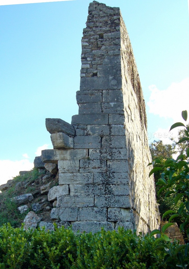 В 11-12 веках остатки крепостной стены были перестроены в христианскую базилику, посвященную Богородице Одигитрии. Икона под стеклом у древней стены напоминает об этом. Сейчас это место называют Pirgos Neratzichas. Насколько мы могли рассмотреть издалека, около иконы стоит зажженная свеча.
