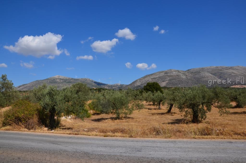 По прилету в Афины сразу нашли стойку регистрации Ависа. Мимо нее пройти практически невозможно в зале аэропорта. Заполнили нужные бумажки, прошли к стоянке, нашли нашу машинку. Сели, поехали. Не смотря на практически бессонную ночь и усталость от перелета, эмоции зашкаливали! Пока двигались из аэропорта в сторону Коринфского канала, по пути вертели головами и все рассматривали: «Ой, горы!», «А вон смотри какие ветряки стоят!», «А дороги-то какие!! Просто полотно!», «Смотри, по обочинам олеандры как бурьян растут!», «А что за красная горная порода такая?», «Море-е-е-е-е!!!», ну и так далее, в том же духе