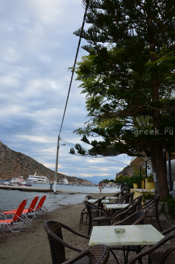 В первый день уже никуда не ехали, решили отдохнуть и отметить это дело. Нашли минимаркет, купили там вина и на утро чая, кофе, и бутербродный набор. Еще попыталась купить какие-то йогурты, которые оказались сметаной J Далее прогулялись по главной улице. Везде таверны, сувенирные лавки, булочная, минимаркеты… Много русских (вот этого нам как раз не хотелось, но в принципе я знала, что в Толо так будет, но у нас ведь впереди Мессиния, а там нашего брата практически не встретишь), меню везде тоже есть на русском. В таверну пока не хотелось, хотелось спокойствия, потому купили в одной из таверен еды на вынос и пошли ужинать на наш балкончик. Когда покупали еду, не знали, что выбрать, и еще не знали реальных размеров греческих порций. Потому взяли 2 гироса с картошкой и два греческих салата, и так получилось, что поужинали мы одним гиросом и одним салатом на двоих, ибо он был огромен! Зато второй гирос отлично пошел на завтрак перед отъездом в Нафплион. Засыпали под мягкий шепот волн под балконом, и это конечно было сказочно…