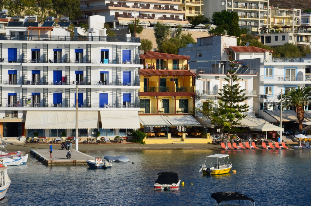 Наш отельчик – между желтым и бело-голубым зданиями, беленький маленький (смотрите на фото ниже). А за сосной на втором этаже открыты двери балкона – это наш номер. Вместе с нами еще жила только одна семья (номер под нами). Стоимость проживания – 30 евро. Можно было заказывать завтраки и обеды по 5 и 10 евро, но мы обычно ели где-то в других местах.