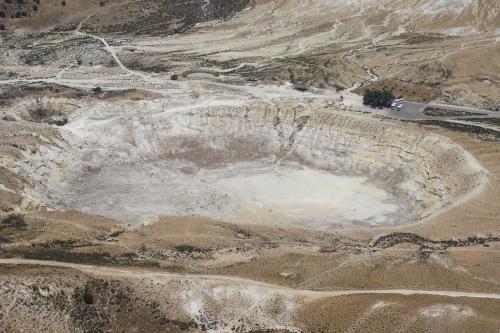 Мы посетили вулканический остров Нисирос. Из порта острова к вулкану приходит сразу много автобусов (это мы наблюдали сверху, из Никии) и народ большой толпой спускается к кратеру вулкана по грунтовой дорожке. А нас привезли позднее, когда основная масса схлынула. Ну и запах там, на вулкане, я вам доложу! Густой и мощный запах серы, наверное, так пахнет в преисподней! В сочетании с жарой в 37 градусов и практически отсутствием ветра – производит сильное впечатление.