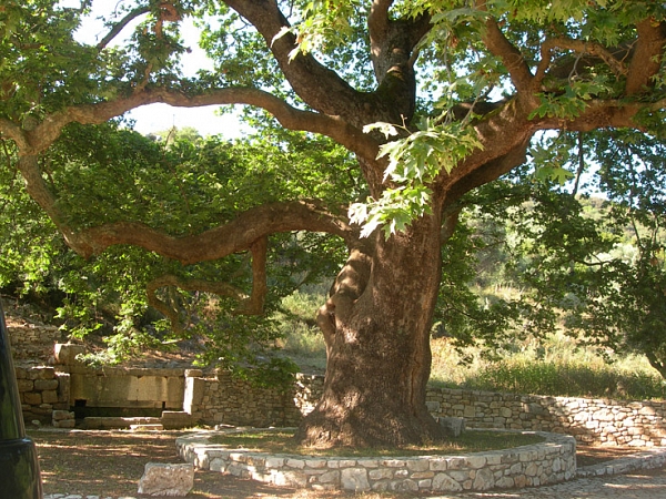 Детям без пляжа не обойтись, делаем остановку. Песок уже успел раскалиться, но чистое море все перебивает и мы базируемся в тенечке,купаемся. Доели арбуз и в путь. Решили заехать к храму Апполону, а вот и указатель к нему. Потом около получаса серпантина с асфальтом, немного серпантина грунтовки и у нас на пути встает гигант. Огромное, величественное древо.