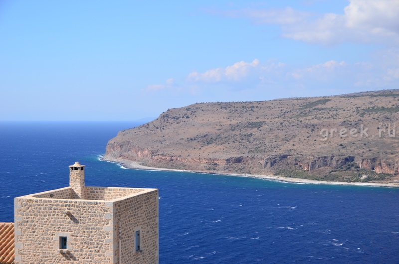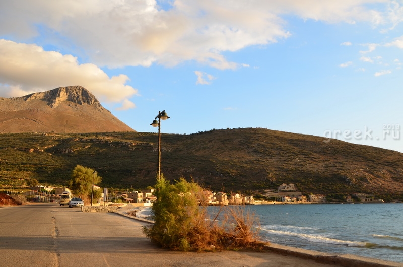 Лоза это была ничейная, просто растёт сам себе виноград, зреет. Ягоды оказались очень вкусные, несмотря на своё «дикое» происхождение. Вот именно в процессе поедания и нашелся очень простой выход, а именно, я задал точку назначения на дороге между Триполи и Спартой. И это сработало. Навигатор пересчитал маршрут и мы в итоге, потеряв более часа, выскакиваем по каким-то полям на трассу, ведущую в Спарту. Мы на свободе. Шоссе многополосное и отличное, но после горных дорог, какое-то скучное. Быстро добираемся до Спарты, и транзитом уходим дальше на юг Пелопоннеса на Мани, в деревню Нео Итило, где у нас забронирован гостевой домик на два дня. Это живописная рыбацкая деревня, построенная на месте древнего города, о котором упоминал Гомер и родина пирата Сакротифа- героя книги Жюль Верна. Побережье Итило считается одним из самых красивых в районе Мани.