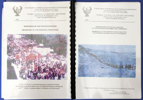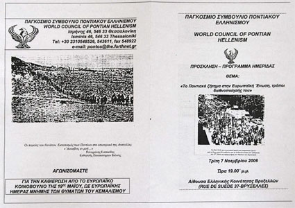 | В Европарламенте [7-11-06 Брюссель] было проведено под эгидой Совета понтийского эллинизма выступление с требованием признания 19 мая – Днем Памяти геноцида Эллинизма Понта, а главе Комиссии внешних дел Евросовета Камелу Эрлингу были переданы документы и книги [Красная река] по истории эллинизма Понта. |