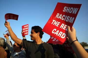 На фото: одна из демонстраций иммигрантов в Афинах «Покажи расизму красную карточку»