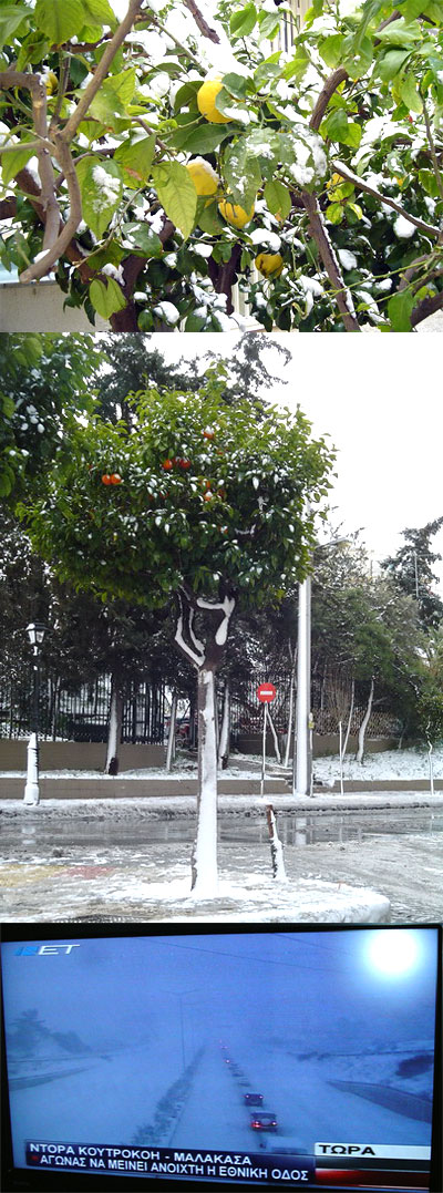 В Афинах снегопад начался поздно вечером в субботу с северных районов греческой столицы и постепенно накрыл собой весь город. Днем в воскресенье снегопад возобновился. Даже в южных приморских районах греческой столицы он продолжался на протяжении пяти часов, закончившись в Глифаде к 20 часам и продолжаясь на момент написания репортажа в Фалиро, покрывая белой пеленой пришвартованные яхты в гаванях Флизвоса и Алимоса.