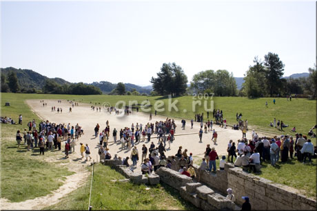 Сам Стадион не выглядит очень комфортным. Вместо трибун по склонам была трава, на которой размещались зрители под палящим солнцем. Зато и сохранился Стадион хорошо, т.к. разрушаться было особо нечему. Некоторые туристы пытаются повторить первый из Олимпийских видов соревнований – бег на один стадий (192,27 м). Другие примеряют своих детей на места олимпиоников. Ну а мне просто приятно находиться на этом древнем и священном месте.